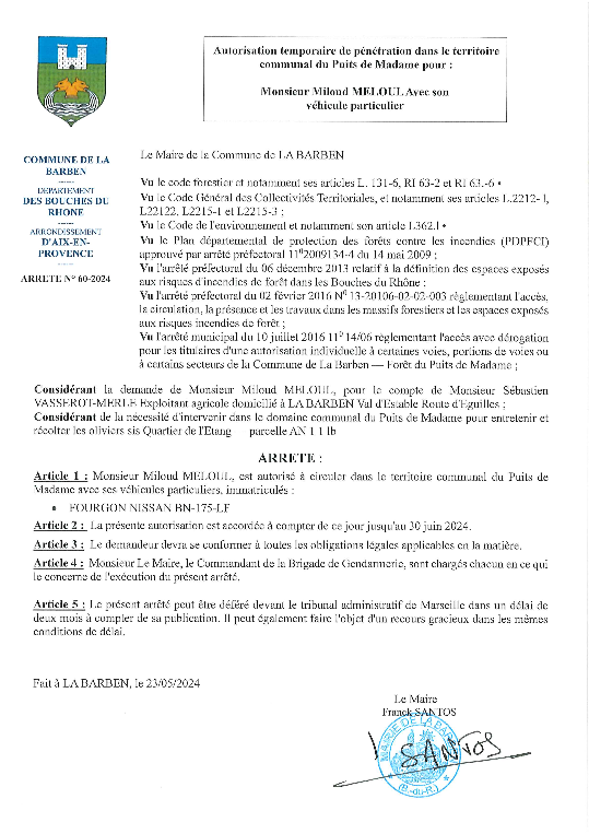 Arrêté temporaire de pénétration territoire communale du Puits de Madame -coltelli raymond